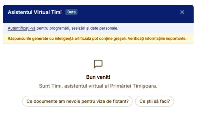 Primăria Municipiului Timișoara lansează un serviciu de asistență virtuală bazat pe tehnologie de inteligență artificială. Asistentul digital „Timi” este integrat în Contul Unic, utilizat de peste 141.000 de timișoreni, și le oferă acestora informații 24 de ore din 24, într-un mod simplu și rapid, fără a mai fi necesară parcurgerea mai multor pagini sau documente. Timi este capabil să comunice în orice limbă și include și un sistem de adresare a întrebărilor și ascultare a răspunsurilor în format audio. Spre deosebire de alte instrumente AI, serviciul municipalității nu furnizează opinii și nu accesează surse externe de pe internet.